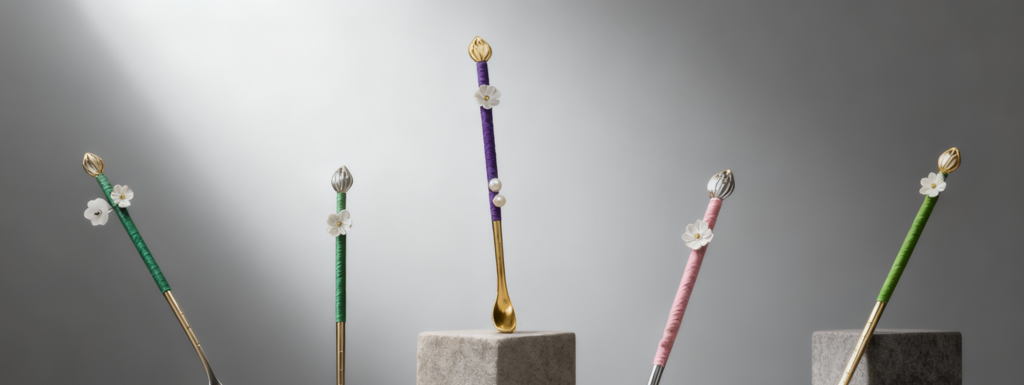 Each scoop is handmade, wrapped in silk thread, finished with pearls and flowers.